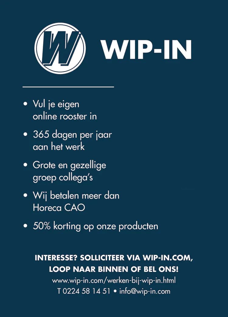 Veel medewerkers van Wip-in blijven voor langere tijd werken, waaruit opgemaakt kan worden dat het met de werksfeer en werktijden wel goed zit. Wil je solliciteren? Vul dan het sollicitatieformulier in. En je mag natuurlijk elke dag een heerlijk vers frietje eten…